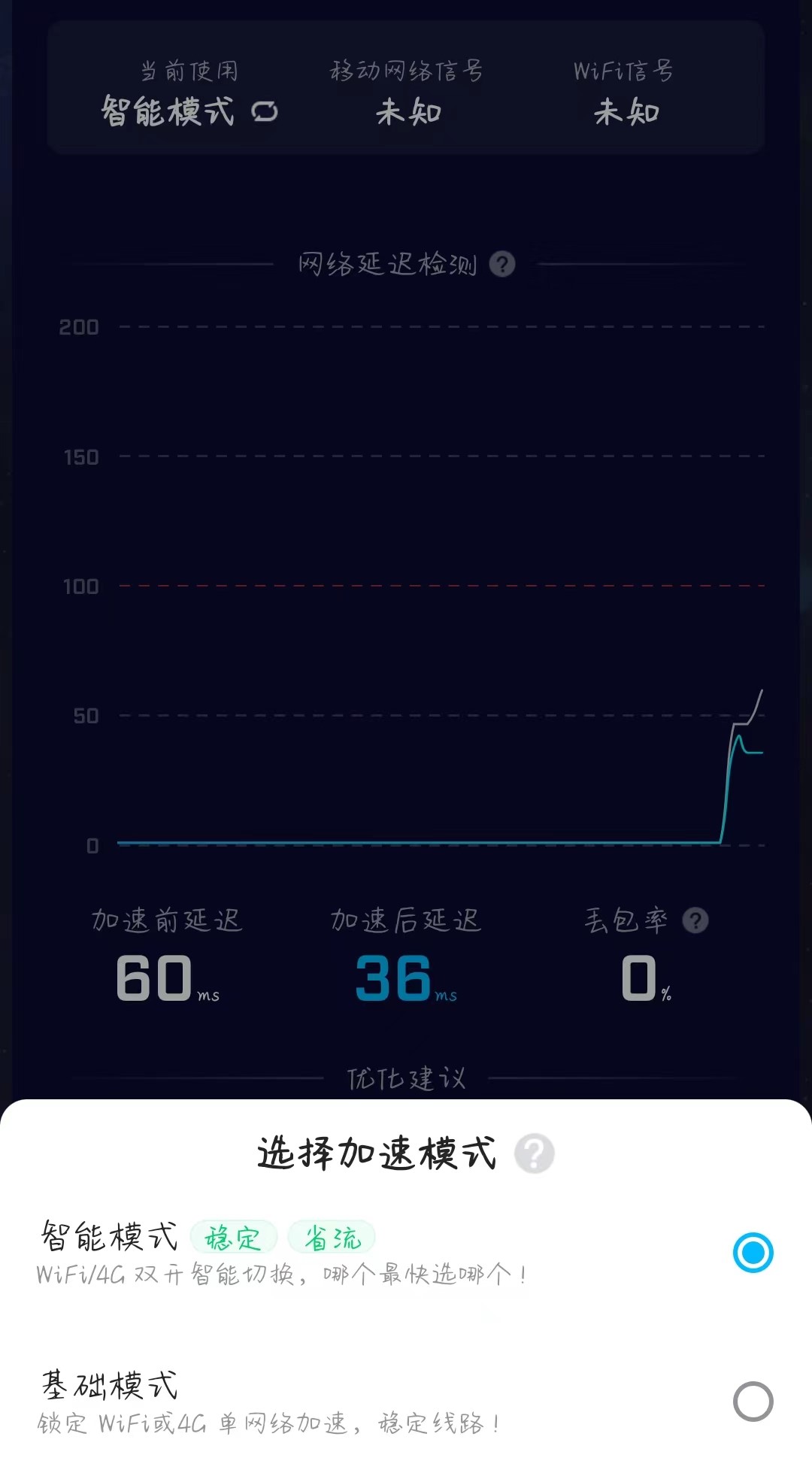 點(diǎn)擊進(jìn)入之后,就可以看到加速選項(xiàng)了。一共有兩種模式可供選擇,一個(gè)是單網(wǎng)絡(luò)加速,穩(wěn)定;另一個(gè)是數(shù)據(jù)和WiFi雙開,智能選擇更快速的一個(gè)。玩家根據(jù)喜好選擇就好。