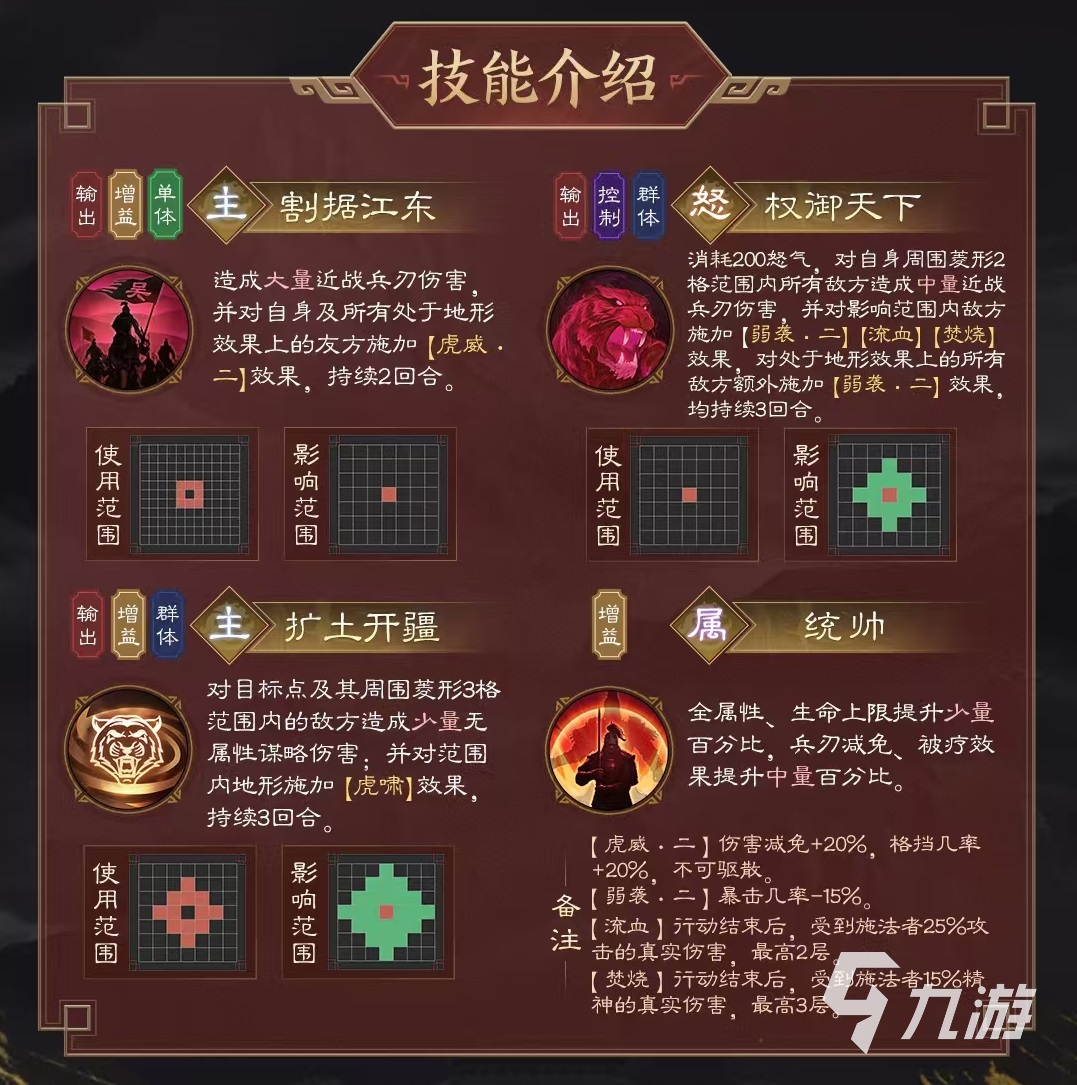 兩個主動技能分別是割據(jù)江中和擴土開疆。割據(jù)江東能對目標造成大量近戰(zhàn)兵刃傷害,對自身以及所有處于地形效果上的友軍施加虎威效果,持續(xù)兩回合。被虎威影響的目標,傷害減免提升,格擋幾率提升。擴土開疆對目標點及周圍菱形三格范圍內的敵方造成無屬性謀略傷害,并對范圍內地形施加虎嘯效果,持續(xù)三回合,這里的虎嘯和天賦所附加的是一樣的。大招權御天下,對自身周圍菱形兩格范圍內的所有敵方造成近戰(zhàn)兵刃傷害,并為敵方施加弱襲、流血、焚燒等效果。