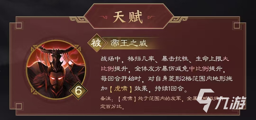 孫權在屬性方面雖然沒有非常搶眼的地方,但各個屬性均衡,這一點也難能可貴。自身還有一個很有特點的地方,就是自身的兵種特性,不會被任何兵種克制,能減少自身受到的傷害。天賦是帝王之威,在戰(zhàn)場中,孫權的格擋幾率、暴擊抗性和生命上限都能得到大幅度提升,全體友方爆傷減免中比例提升。回合開始時,對自身菱形兩格范圍內的地形施加虎嘯效果,持續(xù)一回合,被虎嘯所影響的友軍全屬性略微提升。