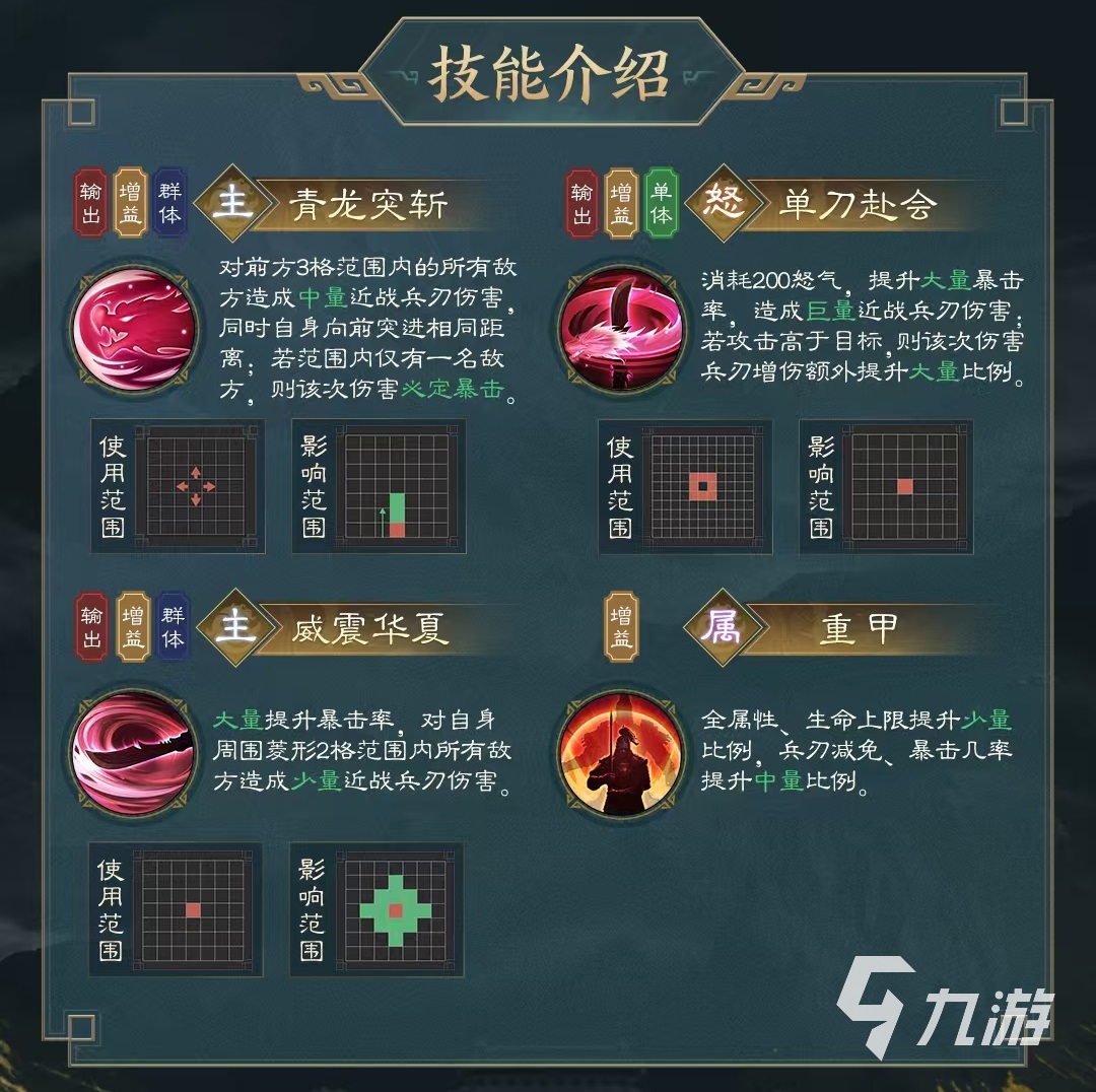 兩個主要技能分別是青龍突斬和威震華夏。青龍突斬的效果是對前方三個范圍內(nèi)的所有敵方造成近戰(zhàn)兵刃傷害,自身向前突進相同距離,如果攻擊范圍內(nèi)只有一名敵方目標,則該傷害,必定觸發(fā)暴擊。威震華夏,大幅度提高暴擊率,自身周圍菱形兩格范圍內(nèi)的所有敵方都受到近戰(zhàn)兵刃傷害。大招單刀赴會,消耗怒氣后釋放,大量提升暴擊率,造成高額近戰(zhàn)傷害,如果關羽的攻擊高于目標,則該次傷害再次額外提升。
