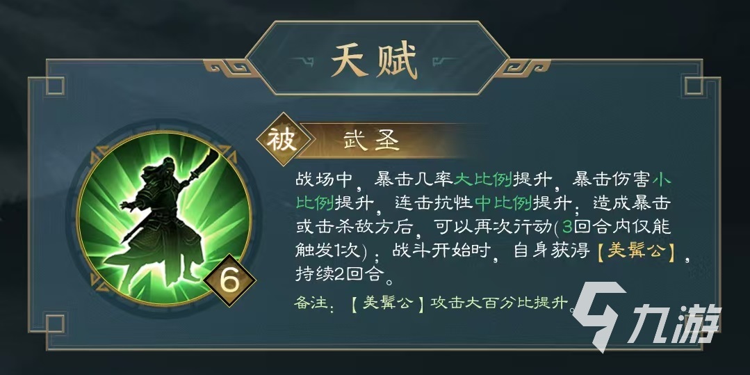 關羽率領的玄甲重騎,在戰(zhàn)斗中有著自身獨特的特技,在戰(zhàn)場中如果受到的是遠程傷害,那么可獲得一定的減免效果。在平原中作戰(zhàn)能提高戰(zhàn)斗力,不適合在山地和建筑中作戰(zhàn),這一點大家使用的時候要了解。關羽的天賦,賦予了在戰(zhàn)場中暴擊幾率大幅度提升,暴擊傷害小幅度提升,連擊抗性中幅度提升的一系列效果。在造成暴擊或者是擊殺敵方目標后,可以再次行動,此效果三回合內(nèi)只能觸發(fā)一次,在戰(zhàn)斗中觸發(fā)美髯公效果,攻擊百分比大幅提升,持續(xù)兩回合。