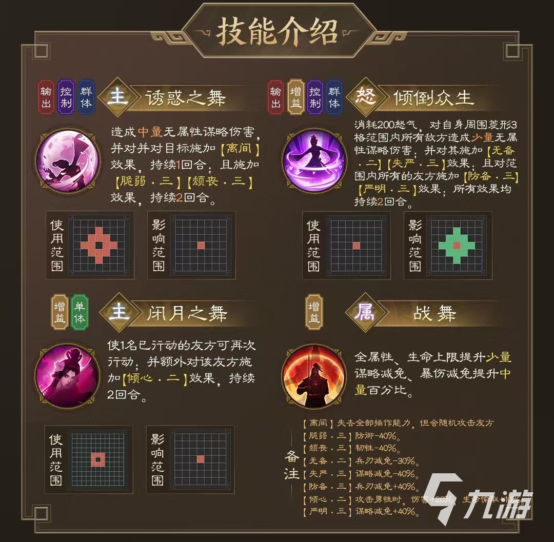 主動技能有2個,第1個誘惑之舞,第2個閉月之舞.誘惑之舞的效果是造成無屬性謀略傷害,并對目標施加離間效果。閉月之舞的效果是使己方已經(jīng)行動的一名武將再次行動,并額外對該目標施加傷害增強的效果。怒氣技能傾倒眾生,消耗200點怒氣釋放,對自身周圍菱形三個范圍內(nèi)的所有敵方目標,造成無屬性謀略傷害。另外,貂蟬如果在船上和沼澤中作戰(zhàn),可以將自身的攻擊力附加到精神上。