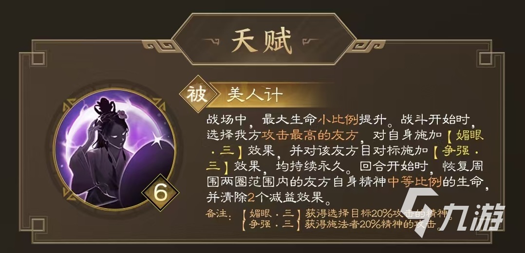 在游戲中,貂蟬是一名及輔助和控制于一身的武將,它可以使一名友軍再次行動,展現(xiàn)出了自身強勢的策略性和不可替代性。在五維屬性方面,毅力直接拉滿,其他屬性中規(guī)中矩。自身的天賦美人計,在戰(zhàn)場中最大生命值小幅度提升,戰(zhàn)斗開始后會選擇一個我方攻擊最高的單位,獲得選擇目標20%攻擊的精神屬性,并對該目標施加自身20%精神的攻擊加成。這兩個效果都是永遠持續(xù)的,在回合開始時,會恢復自身周圍兩圈范圍內(nèi)的友方生命值,并清除兩個增益效果。