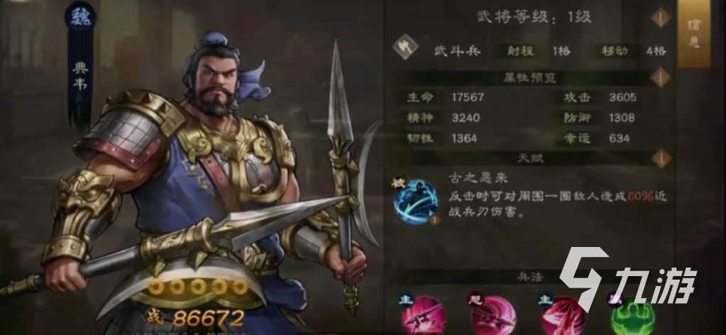 典韋這個(gè)武將一般都是作為坦克來(lái)使用的,但這并不就不能說(shuō)明該角色不厲害,實(shí)際上他也是魏國(guó)非常強(qiáng)勢(shì)的武將。主動(dòng)技能“逐虎躍澗”,立刻跳到指定的位置,隨后對(duì)周?chē)蝗Ψ秶鷥?nèi)所有敵方造成70%近戰(zhàn)兵刃傷害,并添加延續(xù)2回合的“緩兵”效果,如果目標(biāo)已經(jīng)被賦予了緩兵效果,則給敵人附加持續(xù)1回合的“禁足”效果,還會(huì)根據(jù)連擊率額外造成一段50%的傷害,本身這種技能效果就非常不錯(cuò),而在和夏侯搭配使用的情況下,還能提高該武將打出的傷害。作為團(tuán)戰(zhàn)的殺手,反擊和群傷能力還是很強(qiáng)的,更為適合在PVE當(dāng)中使用。