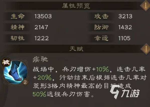 關(guān)羽本身最強(qiáng)的地方在于可以二次行動(dòng)。他的天賦是在擊殺敵人之后可以獲取再次行動(dòng)的機(jī)會(huì)。這個(gè)天賦有著4CD的冷卻。基本上對付普通敵人他一次便可以將其給直接擊敗。這樣在擊敗之后他還可以再次進(jìn)攻一次,這樣可以大大的提升玩家們的作戰(zhàn)效率。關(guān)羽本身的能力很強(qiáng),同時(shí)自身的獲取渠道也比較容易,在初期玩家們便可以獲取到,之后升星也有著穩(wěn)定的獲取碎片的渠道,這個(gè)武將不管是對于新人還是老手來說都是非常好用的一位,玩家們可以重點(diǎn)來進(jìn)行培養(yǎng)。