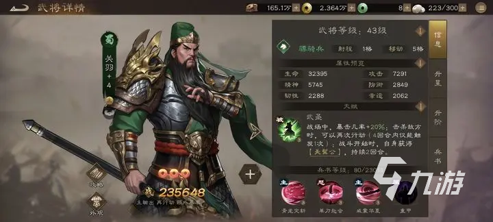 關羽的兵種是玄甲重騎,能抵擋箭矢的傷害,在戰(zhàn)斗時,具有遠程兵刃傷害減免效果,在平原還能提高戰(zhàn)斗力,山地和建筑都是他不擅長的戰(zhàn)斗地形。被動“武圣”,暴擊幾率提升較大幅度,暴擊傷害也有小幅度提升,連擊抗性中比例提升;造成暴擊或擊殺敵方后,能再次行動,還能獲得攻擊提升效果。