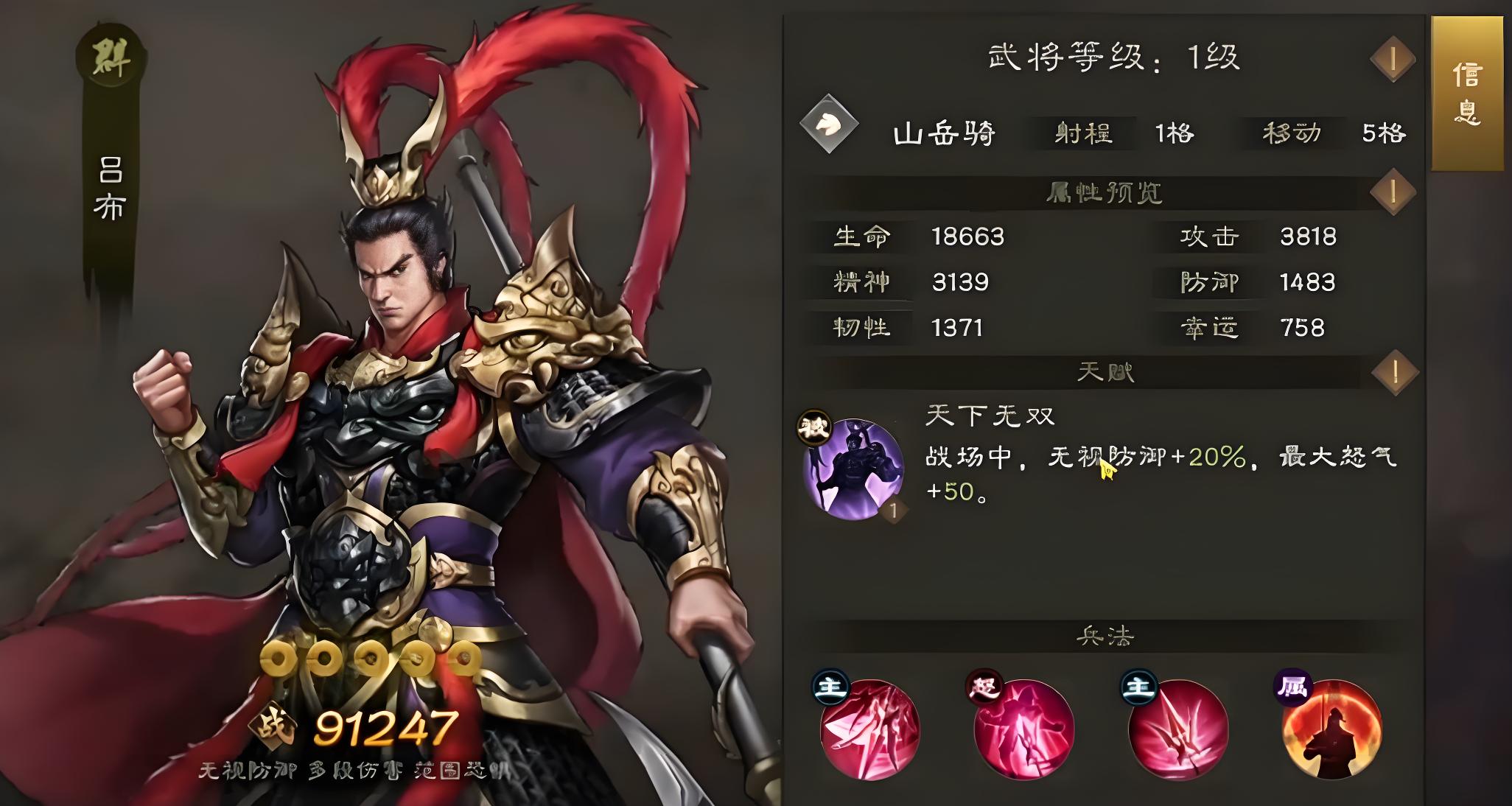 當武將+4的時候呂布能解鎖技能“善戰(zhàn)無前”造成周圍十字格上的目標115冰刃傷害,且進攻前還能額外對目標造成生命值10%的真實傷害,這個技能讓呂布在戰(zhàn)斗上擁有無敵的攻擊效果,關鍵呂布還是“山岳騎”兵種,在對戰(zhàn)中擁有無敵的沖鋒,且攻擊范圍和善戰(zhàn)無前技能一致,能在對戰(zhàn)中擁有無敵的效果。