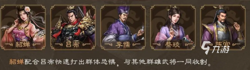 在呂布的對戰(zhàn)陣容上可以選擇:呂布+ 貂蟬+ 李儒+ 董卓+ 華佗。其中呂布負責攻擊,貂蟬是呂布最佳的陣容組合,可以控制敵方目標并離間敵方主將,李儒是毒傷,董卓嘲風抗傷,華佗負責奶。