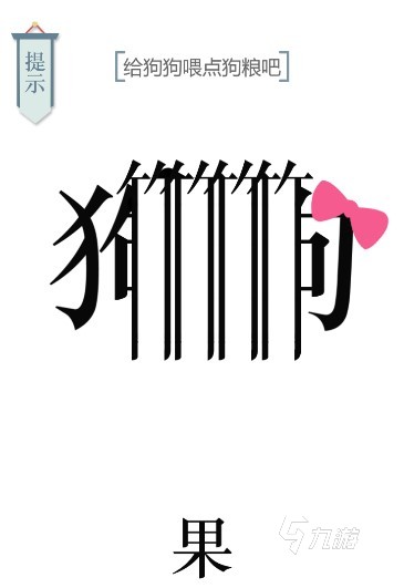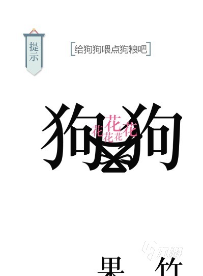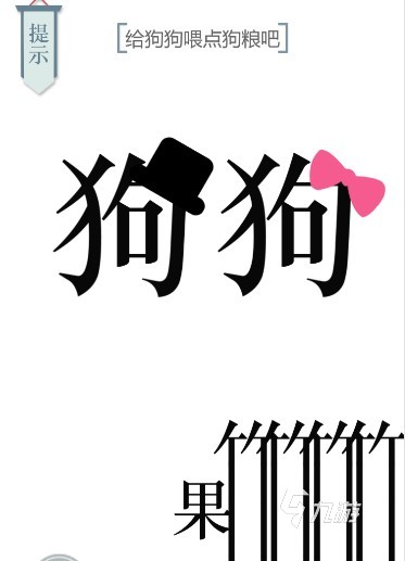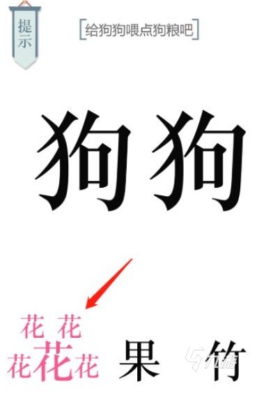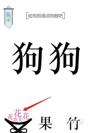 這關一開始會出現(xiàn)五個字,最上面是兩只黑色“狗”字,左下是粉色的花字,中下是黑色的“果”字,右下是黑色的“竹”字,這關通過的方法就是讓狗狗們吃到狗糧即可通關。