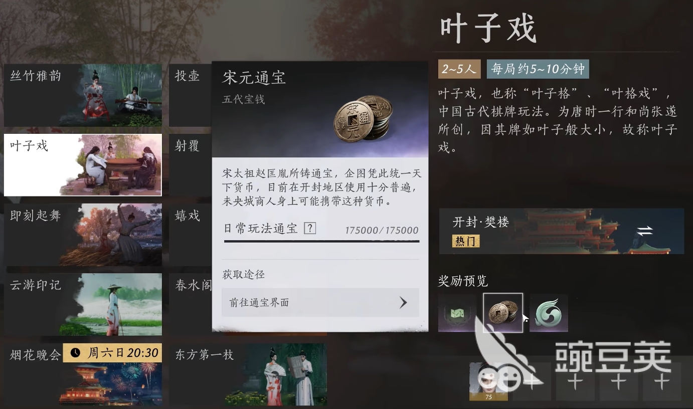 最后一種方法自然是從日常中獲得宋元通寶了,但要注意該方式存在著獲取上限,也是每周會(huì)重制額度,因此在用完本周的額度后就不用再做。目前日常中獲取宋元通寶的玩法有葉子戲和雀神爭(zhēng)霸,它們會(huì)根據(jù)各位游玩該項(xiàng)目的時(shí)間來(lái)給予宋元通寶獎(jiǎng)勵(lì),所以各位在閑暇時(shí)可多去體驗(yàn)下這兩項(xiàng)玩法,爭(zhēng)取將每周的宋元通寶都拿滿。若各位每周的周元通寶兌換未達(dá)到上限,也可在日常里游玩能獲取周元通寶的項(xiàng)目,然后再用兌換的方法,將周元通寶給換成宋元通寶。