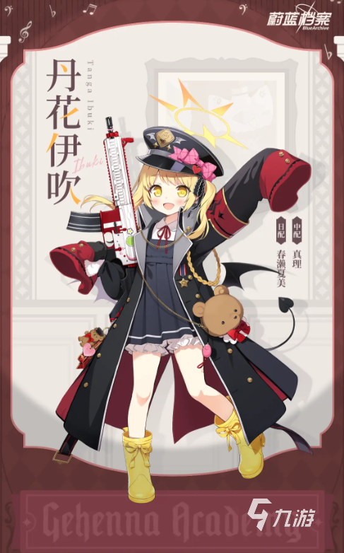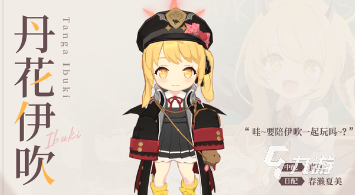 丹花伊吹有著金色大眼睛,以及扎成不對稱雙馬尾的金色頭發(fā),她的身后有一對小翅膀和細(xì)長的桃心尾巴,時常帶著軍官帽,是一個品行端正的孩子,為了不給萬魔殿的前輩添麻煩,每一天都在奮發(fā)向上的努力,她的手中拿著的是從前輩處繼承下來的制式小槍,貼上了自己喜歡的貼紙和掛飾,對于伊吹來說是無可替代的寶物。