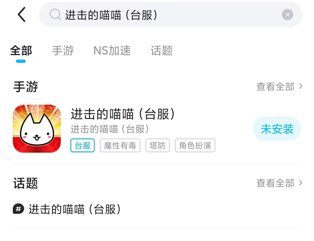 完事后,屏幕上會(huì)顯示相關(guān)結(jié)果,點(diǎn)擊那個(gè)與原題最接近的選項(xiàng)后界面會(huì)跳轉(zhuǎn)至一個(gè)全新的界面,上面會(huì)顯示手游圖標(biāo),話題和NS加速。