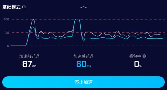 加速啟動之后,玩家首先會進入下圖這個界面,觀看到前后兩條延遲折線圖,看到實際效果后,再確定是否直接進入游戲。