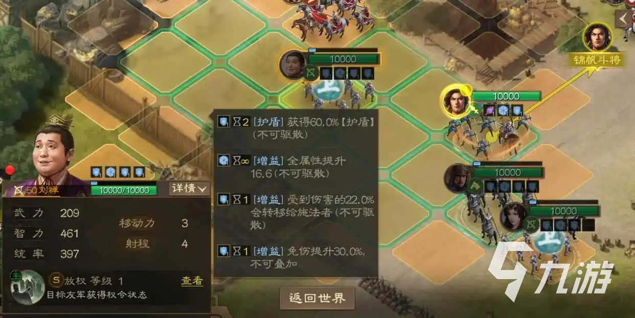自帶戰(zhàn)法可無視地形的阻擋,直接位移到隊(duì)友的位置處,如果友軍身邊沒有位置則不可使用,之后給自己1格范圍內(nèi)的友軍全體分?jǐn)倐?,能承?2%傷害;同時(shí)給己方隊(duì)伍附加60%“護(hù)盾”效果,根據(jù)武力提升護(hù)盾影響;還讓免傷提高30%。