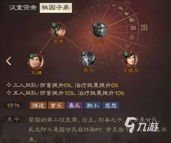他的傳承“樂(lè)不思鄉(xiāng)”會(huì)驅(qū)散掉敵方目標(biāo)身上的三個(gè)增益狀態(tài),并使得其全屬性降低,同時(shí)造成傷害降低,這些效果均會(huì)持續(xù)三回合,可被驅(qū)散,他緣分有“桃園子弟”、以及“漢室宗親”。