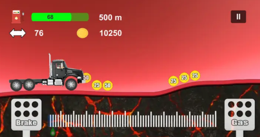 操作方式直觀易上手,從左側(cè)起點(diǎn)出發(fā),目標(biāo)是盡可能順利地到達(dá)右側(cè)終點(diǎn),同時(shí)盡量多收集沿途的金幣與加油卡。金幣可用于解鎖新的車輛與地圖,加油卡則能延長(zhǎng)續(xù)航時(shí)間,避免因燃油耗盡而中途止步。
