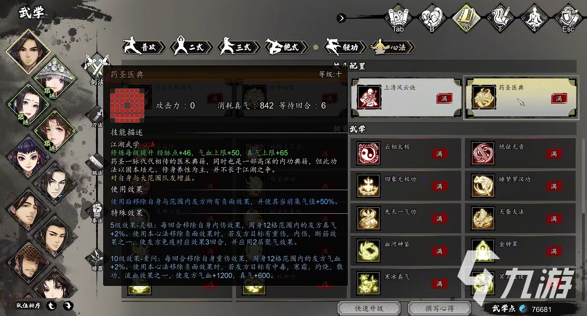藥圣醫(yī)典的效果是每級可提升46點(diǎn)經(jīng)脈點(diǎn),50點(diǎn)氣血上限和65點(diǎn)真氣上限。對自身和大范圍內(nèi)的隊(duì)友,都有著很強(qiáng)的增益效果,使用之后直接將自身和范圍內(nèi)友方身上所有的負(fù)面效果移除,提升50%的集氣值。5級時(shí)觸發(fā)效果靈樞,每回合移除自身內(nèi)傷效果,周圍12格范圍內(nèi)的友方真氣增加2%,在使用本心法移除負(fù)面效果時(shí),如果帶有重傷、內(nèi)傷、斷筋等效果之一,還可以使友方額外免疫對應(yīng)效果三回合。升到10級時(shí)觸發(fā)效果素問,每回合移除自身重傷效果,周圍12格范圍內(nèi)的友方氣血增加2%,使用本心法移除負(fù)面效果時(shí),如果友方目標(biāo)帶有中毒、寒霜、灼燒、散功、流血效果之一。都可以使友方額外增加1200點(diǎn)氣血和600點(diǎn)真氣。