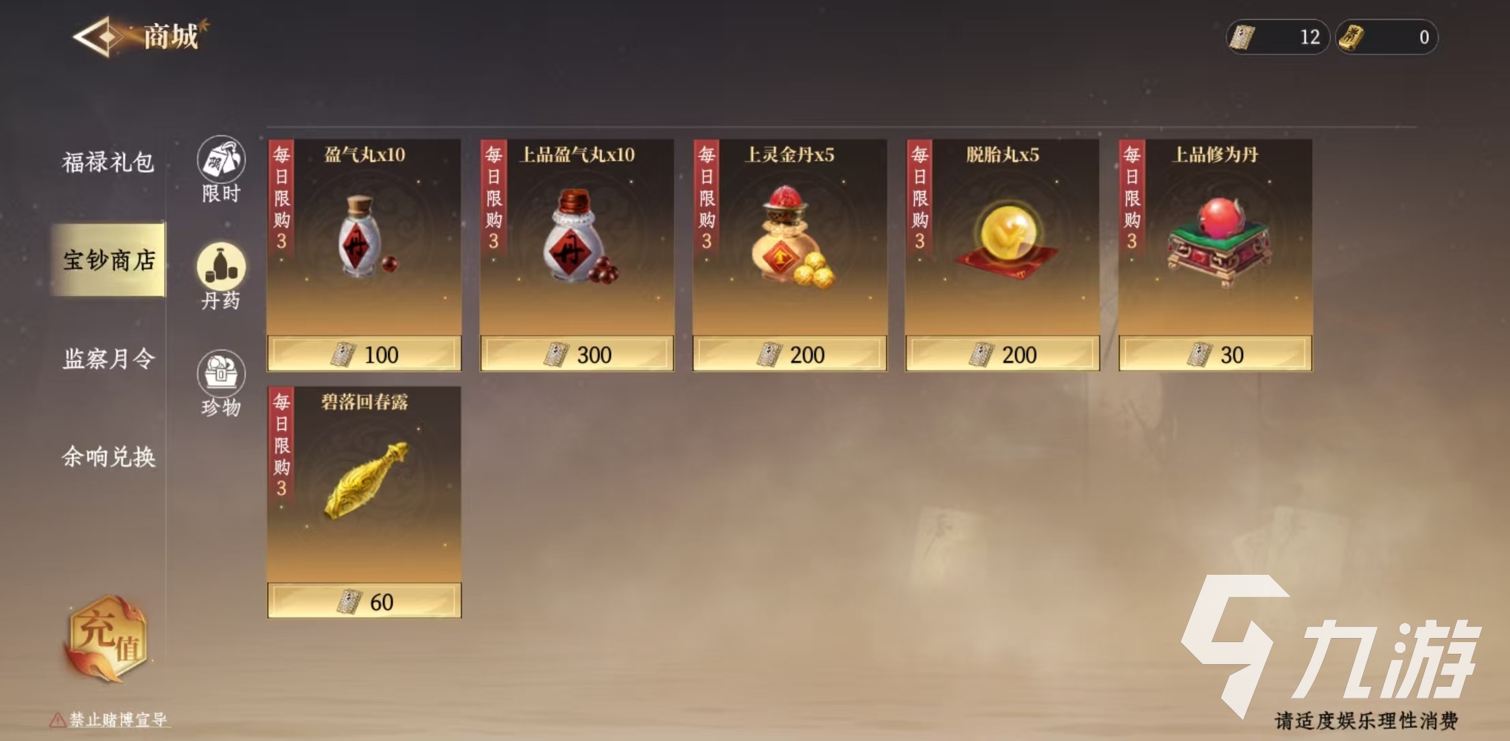 要想獲得這些藥品主要途徑,包括自己動(dòng)手煉制和商店購買這兩類。先來看一下商城都可以買到哪些藥品,打開商城之后選擇寶鈔商店,然后選擇其中的丹藥,就可以看到當(dāng)前所能購買到的所有藥品。主要包括盈氣丸、靈金丹、脫胎丸、修為丹、碧落回春露等,這里能夠買到的大多數(shù)都是屬于品質(zhì)比較高的類型,如果有多余的寶鈔可以選擇購買,用于提升戰(zhàn)力。