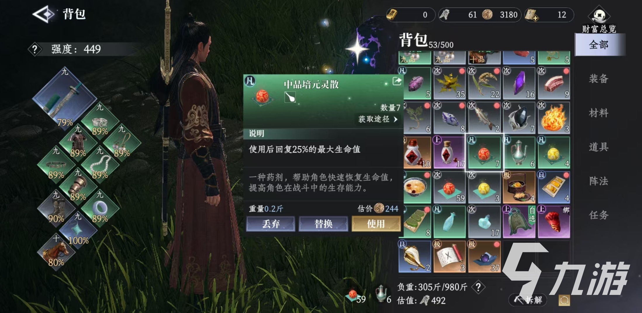 游戲中的藥品有著多種分類,首先是最基礎(chǔ)的一類,可以在戰(zhàn)斗中恢復(fù)角色血量,這也是大家在游戲里最常用的,例如培元靈散等,品質(zhì)越高恢復(fù)的也就越多。但還有其他的類型,例如健骨復(fù)心丹,使用后能夠恢復(fù)角色健康值?;厍迓叮褂弥竽芗铀倌芰炕謴?fù)速度。沖督脈丸,使用后可以加快體力恢復(fù)速度等,這些都是藥品的重要組成部分。