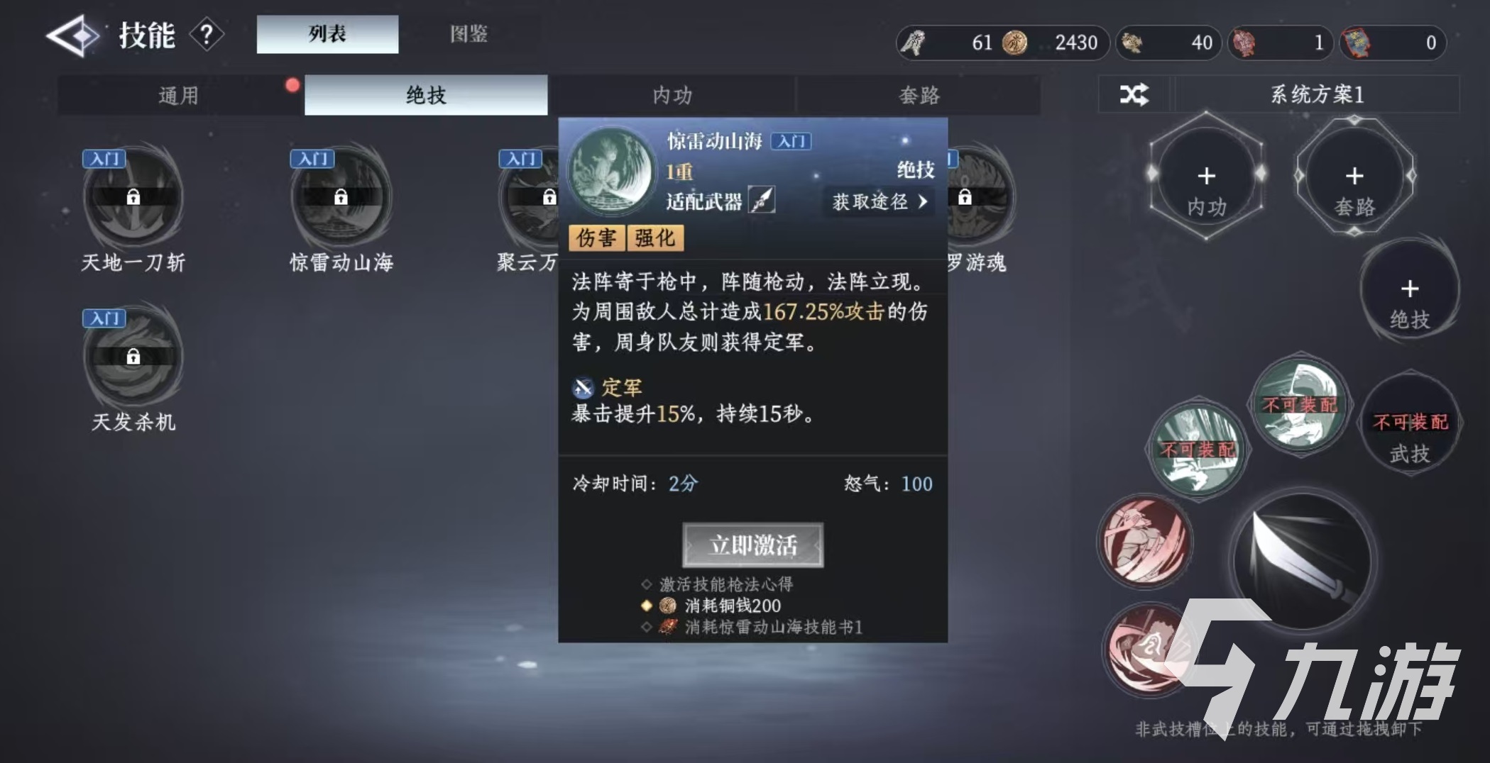 第2個(gè)驚雷動(dòng)山海,適配武器是槍,對(duì)周圍敵人造成傷害,周圍的隊(duì)友能獲得定軍效果,定軍能夠增加15%的暴擊屬性,持續(xù)15秒鐘。這個(gè)絕技的傷害雖然不高,但是是屬于范圍類型,而且對(duì)于隊(duì)友都有著很好的提升,所以也是核心技能。第3個(gè)聚云萬里殺,適合拳套,爆發(fā)出最強(qiáng)一擊轟擊敵人,造成高額傷害并對(duì)攻擊地點(diǎn)進(jìn)行灼燒,對(duì)敵人施加焚燒效果,持續(xù)10秒鐘,最高能疊加到三層。