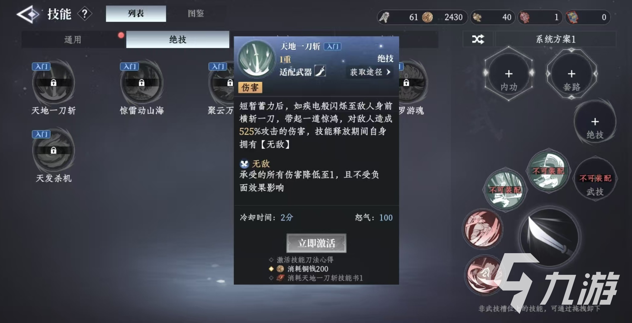 目前游戲一共提供了6種絕技,分別對(duì)應(yīng)的6種武器。第1個(gè)是天地一刀斬,適配的武器是刀,在短暫蓄力后,快速閃爍到敵人身前橫斬一刀,對(duì)敵人造成高額攻擊力的傷害。技能釋放期間,自身擁有無敵效果,在無敵的時(shí)候,所承受的所有傷害都會(huì)降低為1點(diǎn),而且不受負(fù)面效果影響。該技能冷卻時(shí)間兩分鐘,需要消耗100點(diǎn)怒氣,這個(gè)技能可以說將刀的優(yōu)勢(shì)真正發(fā)揮了出來,既能快速接近敵人,又可以利用無敵躲掉傷害。