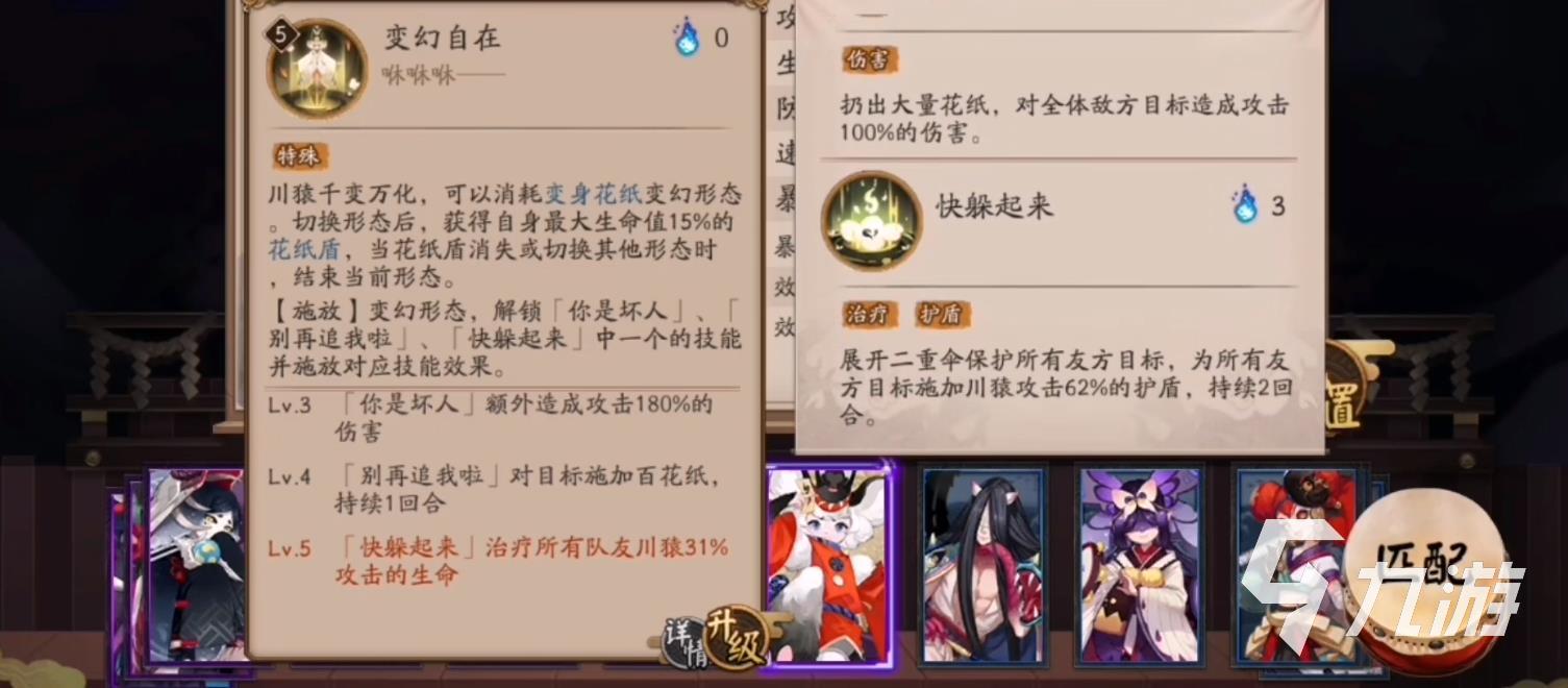 另一個(gè)就是“快躲起來”,可以為己方全體撐起一個(gè)護(hù)盾,相當(dāng)于其攻擊的百分之六十二,一共有兩個(gè)回合的效果。此外,在變換形態(tài)之后,其自身還能得到一個(gè)花紙盾的buff,相當(dāng)于自身最高血量的百分之十五。