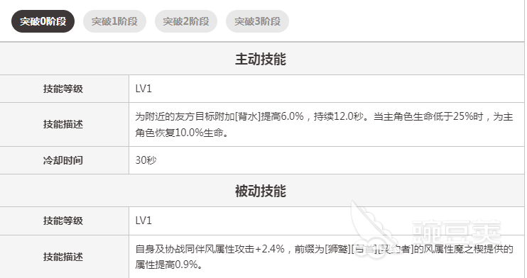 先來看一下獲取的方法,獲取方法比較簡單,只有一個途徑,那就是吟游詩集。接著就是看一下技能的機(jī)制,不管是被動技能還是主動技能,都會比較適合風(fēng)屬性的隊伍。第1個技能就可以給附近的友方成員增加一個背水的屬性,而伴隨著等級的提升,背水屬性就會有所改變。持續(xù)的時間是固定12秒,但是冷卻是30秒。第2個就是主角色血量一旦在低于25%之后,那馬上就可以恢復(fù)百分之的生命值,這個續(xù)航在血量缺少時是比較關(guān)鍵的。