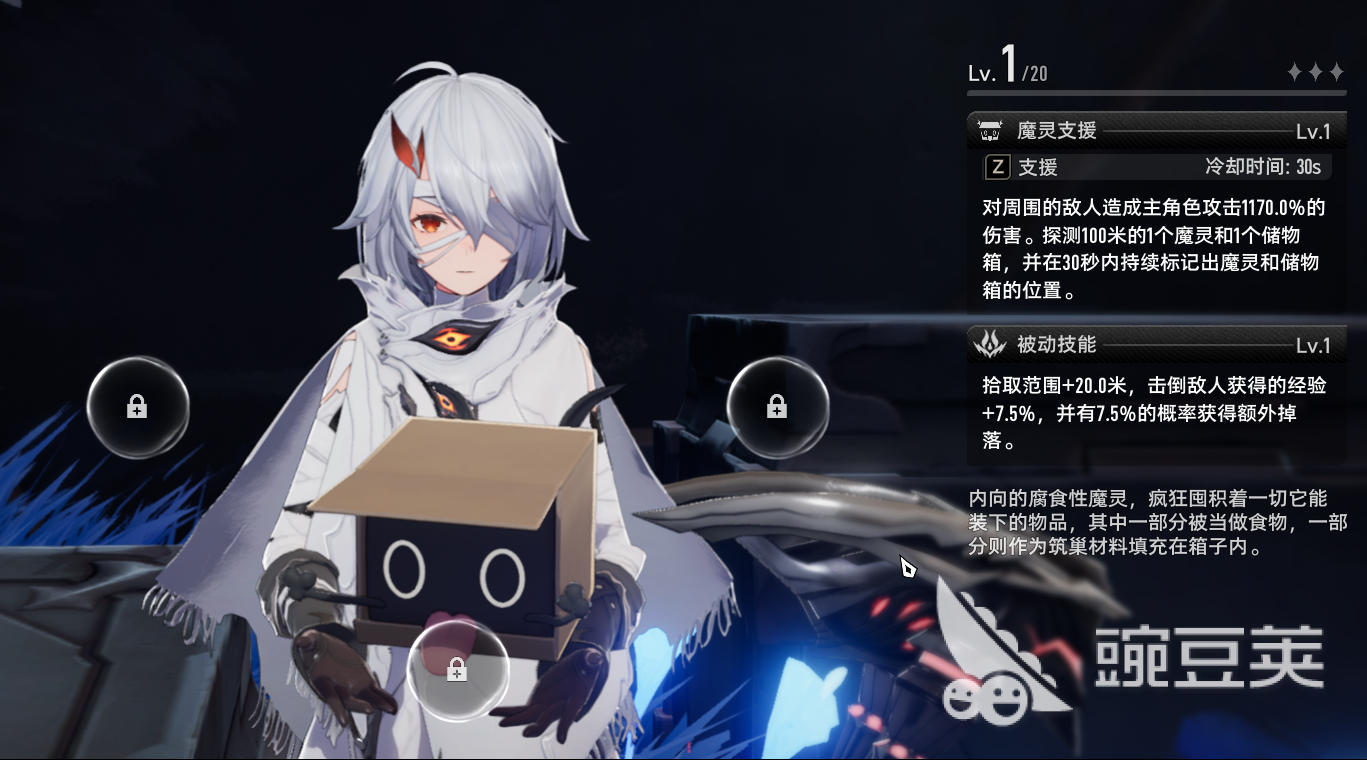 你好箱的主動技能名為【魔靈支援】,冷卻時間30秒。技能釋放后,會對周圍敵人造成主角色攻擊力1170%的范圍傷害,同時還能在半徑100米范圍內(nèi)探測出1個魔靈與1個儲物箱,并在接下來的30秒內(nèi)持續(xù)標記它們的位置。對于喜歡探索和收集的玩家來說,這個技能非常實用。不僅能幫你發(fā)現(xiàn)隱藏的寶箱與稀有魔靈,還能在清理區(qū)域敵人的同時快速找到資源點。
