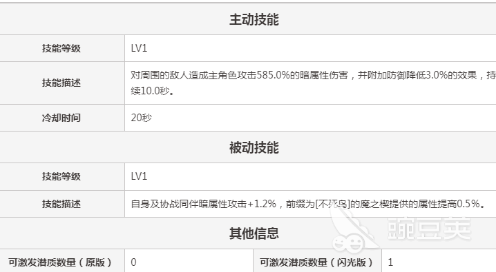在進(jìn)入到第三階段時(shí),主動(dòng)技能就可以直接飆升到1170%的暗傷,冷卻又回到20秒,不死鳥加成是0.9%,此時(shí)就會(huì)變成暗隊(duì)的核心輔助。主動(dòng)技能cd較短,傷害性較高,減防效果也會(huì)覆蓋所有。把被動(dòng)屬性加成全部疊加起來就可以讓暗傷屬性輸出直接提升一個(gè)檔次,在面對(duì)boss時(shí)作用還是比較強(qiáng)烈的。這里還有一個(gè)很容易被忽略的點(diǎn)閃光版就要比原本更強(qiáng)一些,突破三之后還會(huì)有三個(gè)可激發(fā)的潛質(zhì),閃光板就可以直接到4個(gè),每多一個(gè)前置就可以多解鎖一個(gè)小屬性加成。要是后期資源足夠,建議直接升級(jí)到第2個(gè)版本。