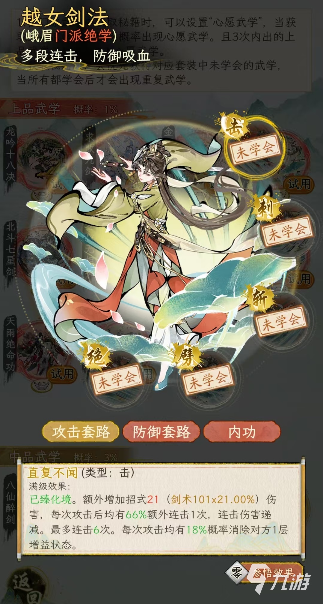 金剛降魔劍的防御套路,特點(diǎn)是防御成功時有幾率給自身附加金身狀態(tài)。在此狀態(tài)下受到攻擊只減少1點(diǎn)氣血,生效1次,是非常強(qiáng)勢的防御型套路,所以說金剛降魔劍真正做到了有攻有防非常全面。越女劍法的特點(diǎn)是具有多段連擊效果,有吸血的能力。攻擊套路是每次攻擊后都有幾率觸發(fā)額外的連擊,連擊傷害遞減。根據(jù)不同招式,最多連接次數(shù)有所不同,例如絕式百無禁忌,最多能連擊8次,另外每次攻擊還有幾率消除對方1層增益狀態(tài)。防御套路則是在防御成功后為自身附加吸血。