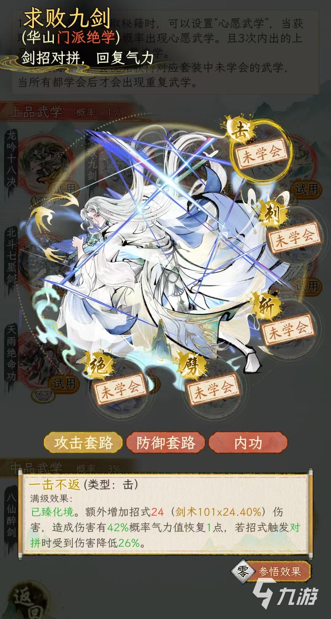 對于大絕大多數(shù)玩家來說,在抽武學(xué)的時候,心愿設(shè)置的重點(diǎn)都是上面所說的這兩個,它們是當(dāng)前最好的選擇。接下來的其他門派就沒有太明顯的區(qū)別,比較推薦的是華山派的絕學(xué)求敗九劍,丐幫派的絕學(xué)龍吟十八絕,六扇門的絕學(xué)一萬八千劍等。丐幫的龍吟十八絕具有擊暈對方,使其無法行動的優(yōu)勢求,敗九劍則是在劍招對拼時可恢復(fù)氣力,一萬八千劍能掠奪增益,附加禁療。所以這三個比較推薦。