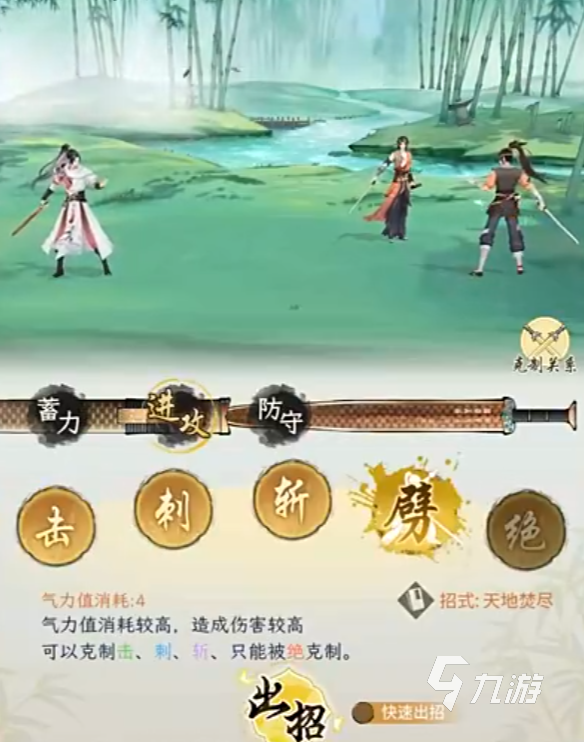 進(jìn)入戰(zhàn)斗對(duì)局后,大家能看到三個(gè)選項(xiàng),分別是蓄力、進(jìn)攻和防守,進(jìn)攻可以選擇人物的輸出招式,對(duì)敵人造成相應(yīng)的傷害,每一個(gè)角色分別有5招能力,分別是擊、刺、砍、劈、絕,越靠后傷害越高,并且也能克制前面的攻擊。