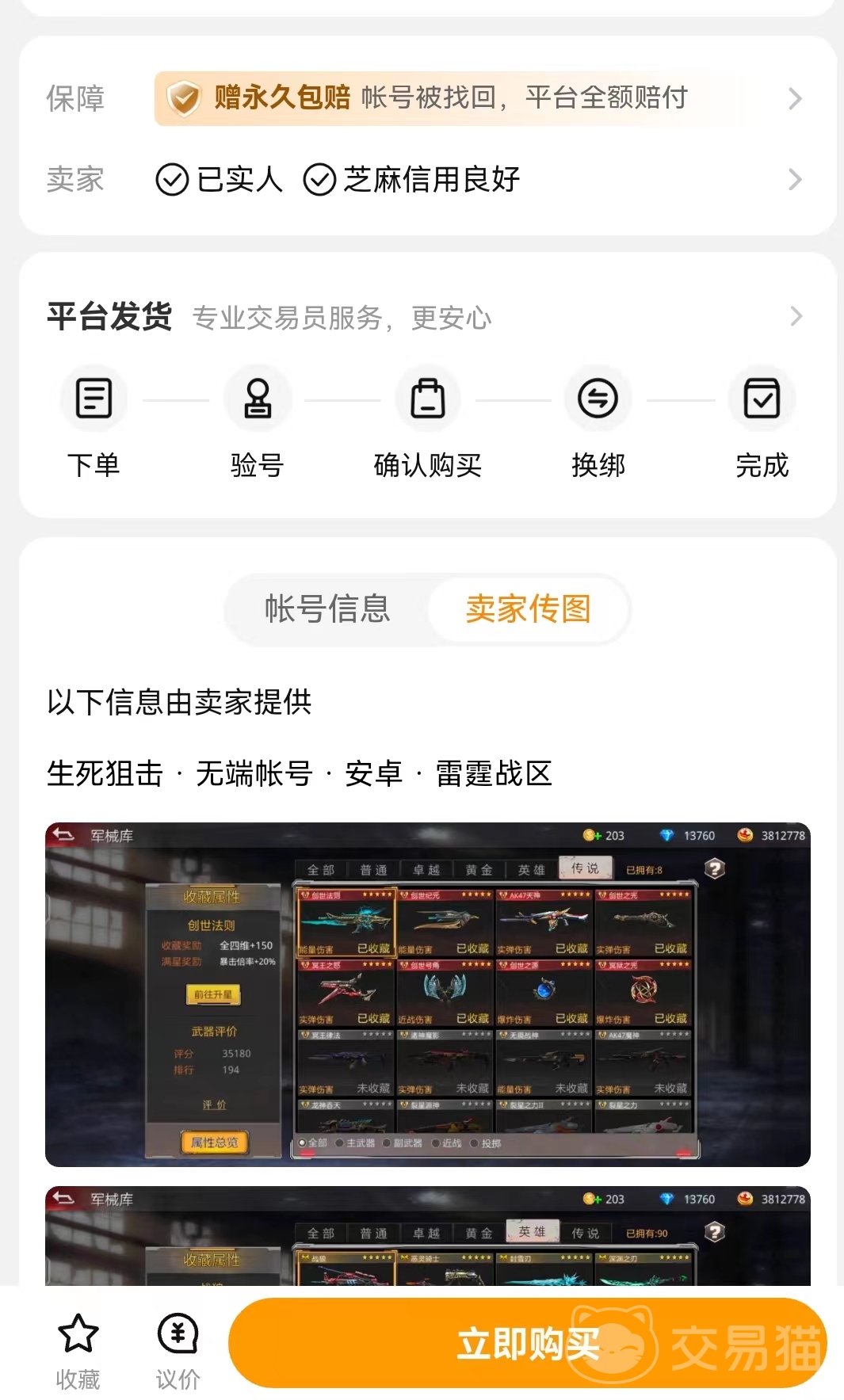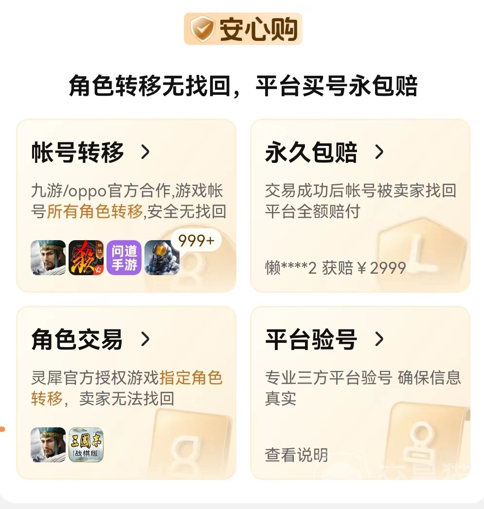 很多玩家在玩游戲的時(shí)候,需要精良的武器,這樣才能獲得榮譽(yù)感,便進(jìn)行購買賬號(hào),可惜的是找不到正規(guī)的平臺(tái),玩家們往往被騙,為此小編推薦在交易貓買號(hào),交易貓是完全保障交易的安全平臺(tái),賣家要賣賬號(hào)都會(huì)實(shí)名并且登記個(gè)人信息,所以不會(huì)出現(xiàn)跑路、被騙等情況,部分產(chǎn)品還支持安心購服務(wù),有了該服務(wù),玩家可以安全的進(jìn)行賬號(hào)轉(zhuǎn)移,購買后如果賬號(hào)被賣家收回或者異常,平臺(tái)承若全額賠付,玩家們還可以直接在平臺(tái)進(jìn)行帳號(hào)轉(zhuǎn)移。
