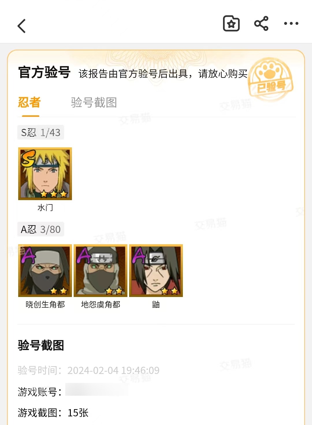 在交易貓上這款游戲的賬號商品圖標(biāo)上如果有標(biāo)注【官方驗號】標(biāo)識,那么說明這個賬號內(nèi)的道具詳情和擁有的角色數(shù)量和品質(zhì)都已經(jīng)經(jīng)過了驗證。在商品的詳情頁面上還有整個驗號過程的截圖,截圖內(nèi)容中非常詳盡。玩家最為關(guān)心的忍者數(shù)量、裝扮套裝、通靈獸詳情、密卷數(shù)量都詳盡的展示出來。經(jīng)過官方驗證過的賬號玩家可以放心購買。經(jīng)過驗號的賬號還有個好處就是縮短交易的流程,在經(jīng)過驗號的賬號商品詳情頁上會顯示這款游戲賬號商品的交易過程,省去了驗號的流程之后就只剩下簡單的3步了。