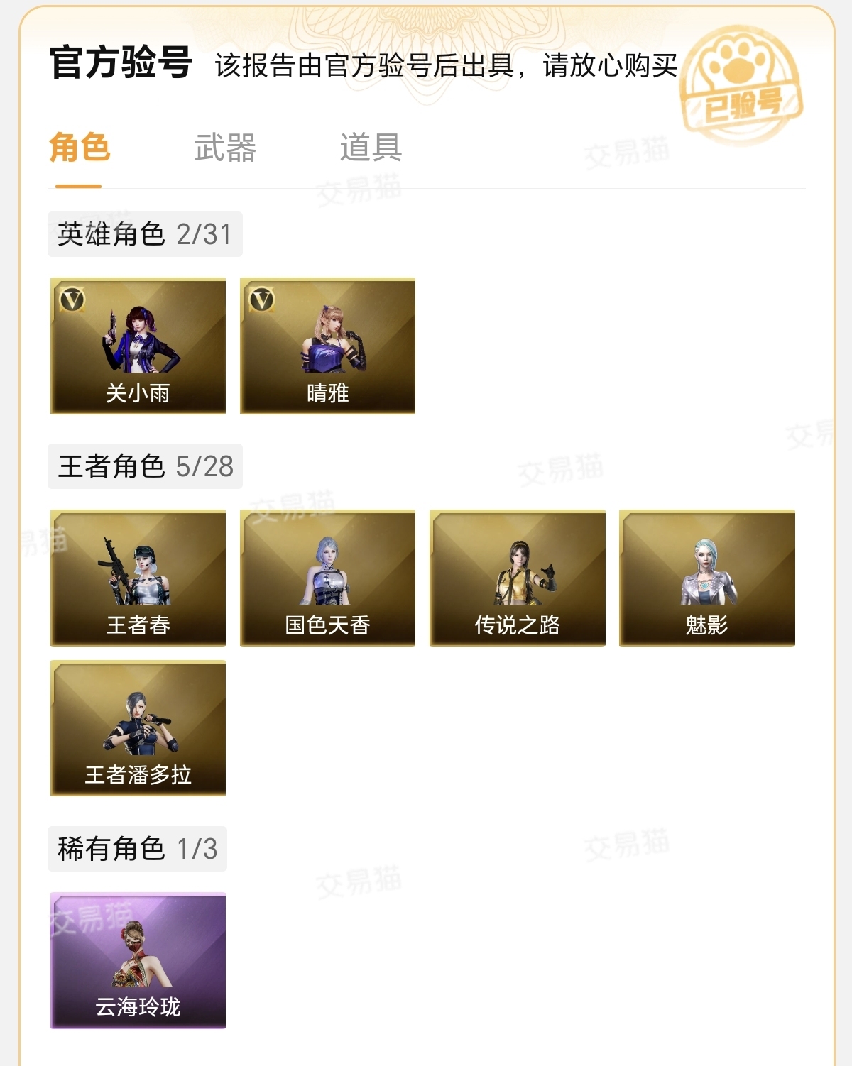 交易貓對(duì)打擊虛假賬號(hào)的力度非常強(qiáng),特別是推出了官方驗(yàn)號(hào)功能。上架的賬號(hào)會(huì)在平臺(tái)交易員的托管下,由專業(yè)人員進(jìn)入賬號(hào)中自動(dòng)統(tǒng)計(jì)解鎖的各種品質(zhì)武器、角色及其對(duì)應(yīng)的皮膚收藏情況。在查看賬號(hào)信息時(shí),您可以進(jìn)入驗(yàn)號(hào)報(bào)告板塊進(jìn)行檢索和選擇,這樣的功能極大地方便了用戶。