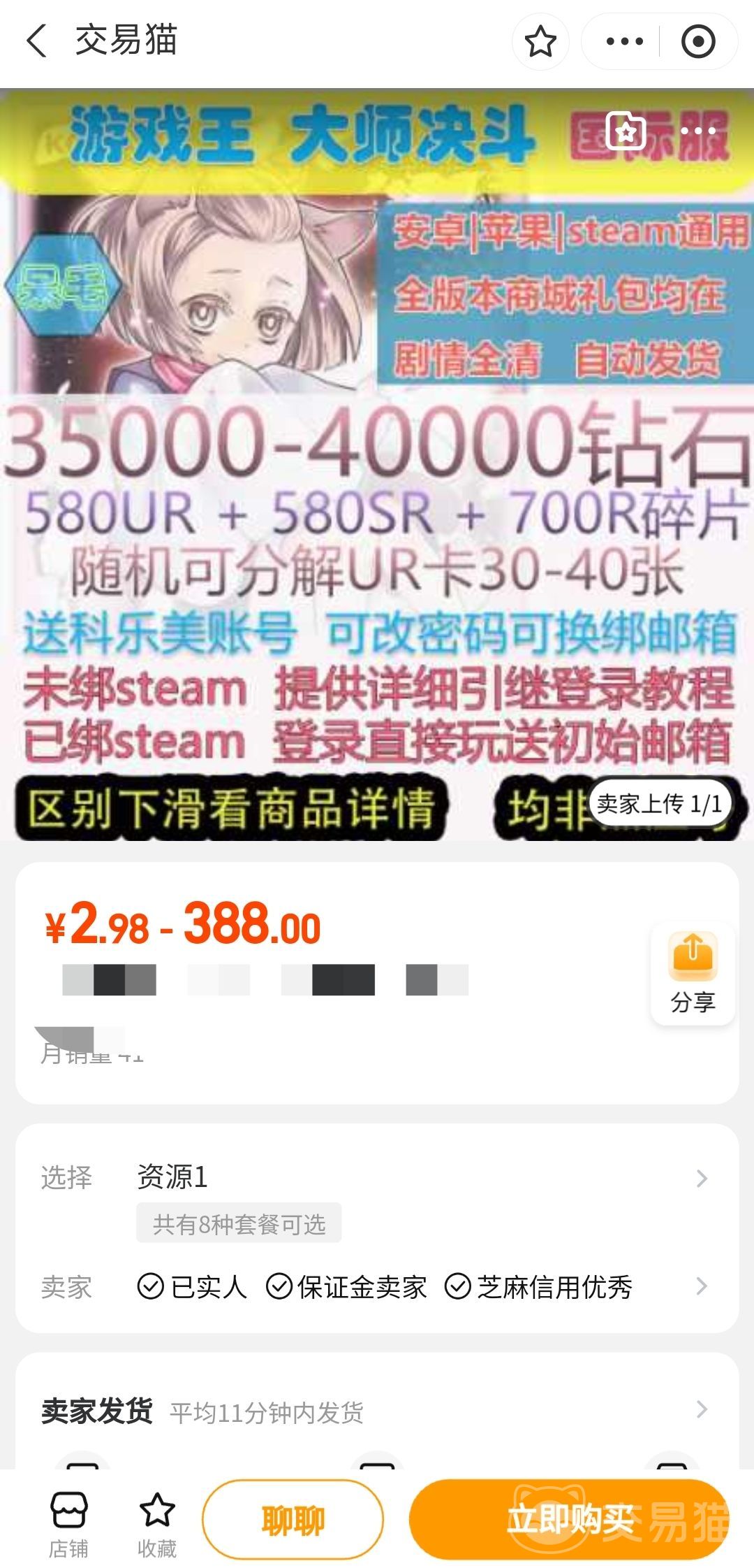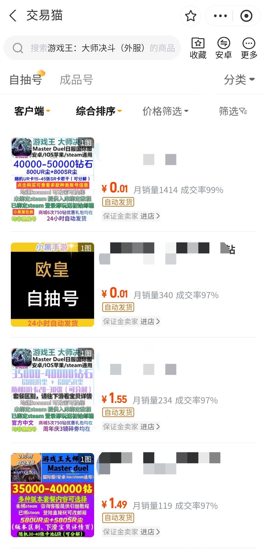 針對這款游戲的首選平臺推薦,小編強烈推薦使用交易貓。該網(wǎng)站主要是做游戲賬號方面的交易,內(nèi)部提供大量豐富的游戲王大師決斗賬號供玩家選擇,其中涵蓋渠道服賬號、初始號、成品號和什么都有的大神號等多種類型。這些賬號價格便宜實惠,讓玩家能根據(jù)自身需求輕松選擇。