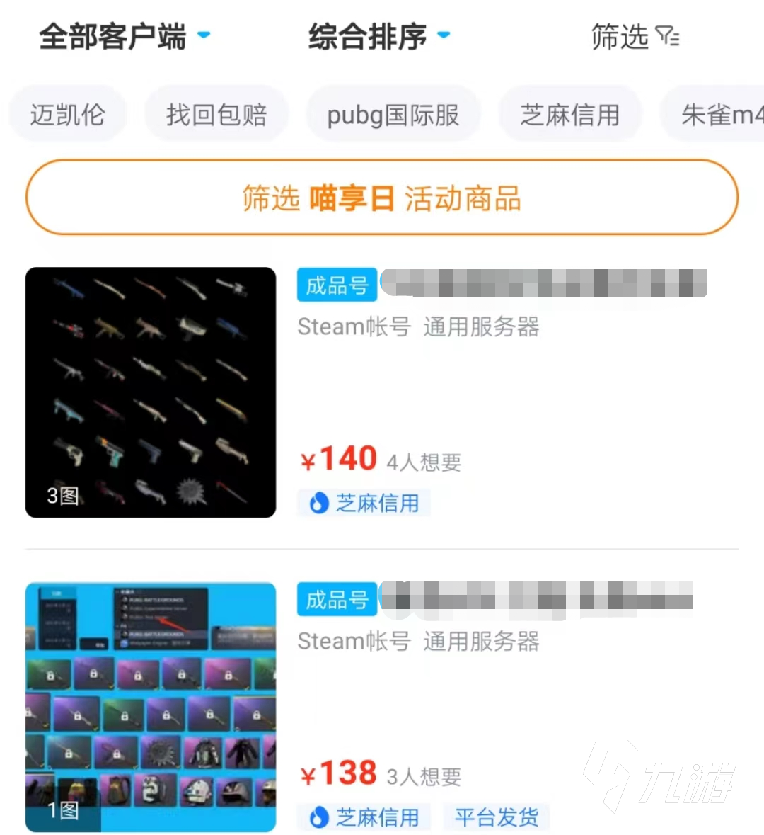 進(jìn)入平臺以后大家先搜索絕地求生,然后就能看到大片大片正在出售的賬號。為了精確估價,大家還要在眾多商品里面挑選出跟自己賬號類似的商品,比如等級差不多、擁有的皮膚差不多、戰(zhàn)績數(shù)據(jù)也差不多,這樣才有參考性。同時也可以看看條件比自己賬號優(yōu)秀一些的,對比價格,就能知道自己的賬號大概在多少價錢上下了。