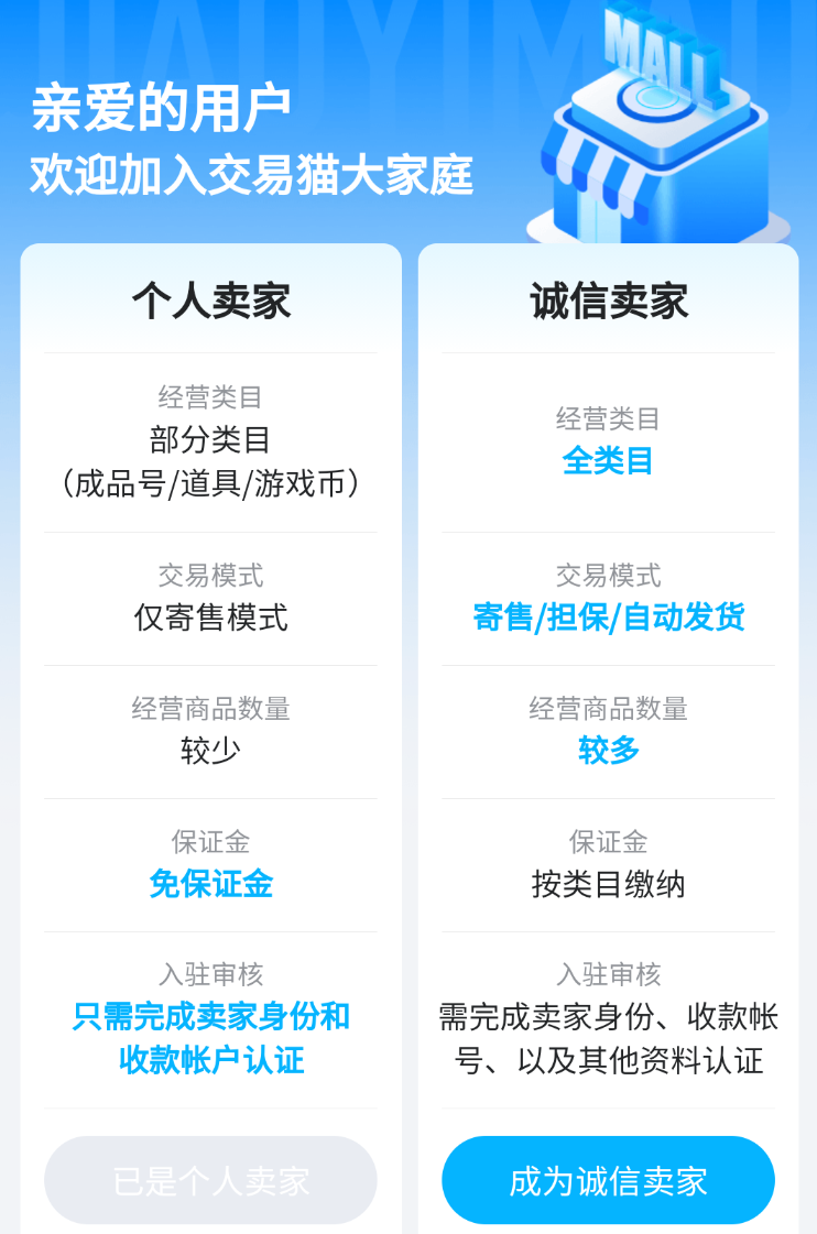 2.專門的賣家通道,對(duì)于長期使用交易貓賣號(hào)的小伙伴,小編建議大家了解一下它的誠信賣家通道,平臺(tái)內(nèi)有著明確的指示,只要完善好相關(guān)資料,并繳納一定的保證金,即可由個(gè)人商家升級(jí)為誠信商家,不僅經(jīng)營類目有所增加,其交易模式也有完善,其中包括寄售、擔(dān)保以及自動(dòng)發(fā)貨等功能,非常方便,它還能提高賣家賬號(hào)的曝光率,是一個(gè)提高賣號(hào)收入的穩(wěn)定渠道。