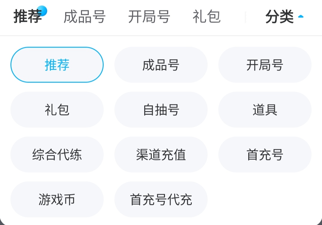 我們在購買賬號的時候,可能因為賬號的價格等原因,不會考慮直接購買一個成品號,而是購買一個首充號或者自抽號,這種賬號雖然沒有高的等級,但是卻有大量的資源,可以供我們自行消費。而在交易貓當中就特意為這些賬號進行了分類,用戶想要購買哪個賬號可以直接點擊賬號的分類,就能在該區(qū)塊里直接購買。不僅如此,交易貓中還有充值代練等服務(wù),可以說有關(guān)游戲賬號的一切需求交易貓幾乎都能為用戶解決。