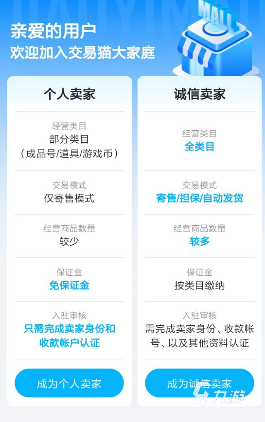 2、不過,想要讓商品正式的發(fā)布出去,大家也需要完成關于賣家身份的申請,只有得到了賣家的資格過后,玩家們的賬號才會擁有發(fā)布商品的功能。不過大家也不必擔心,針對個人賣家的話,平臺的整個認證流程非常的簡單,幫助各位節(jié)約了大量的申請時間。