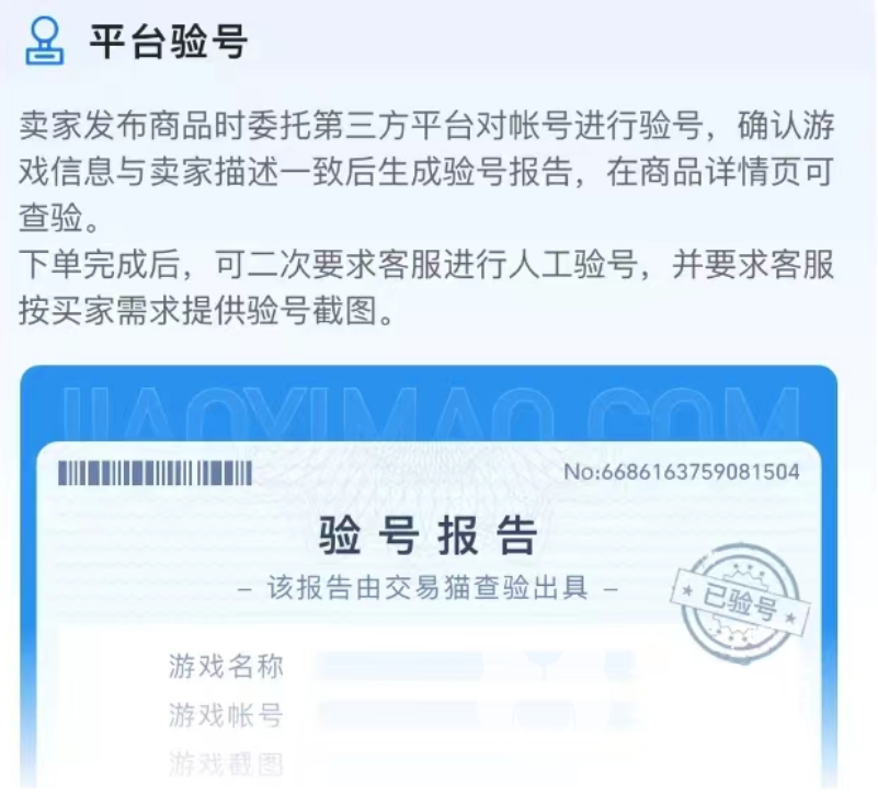 之所以會讓大家來了解一下交易貓,核心在于平臺會針對用戶發(fā)布的每一個商品進(jìn)行驗號,這一點就保障了商品的真實性,大家自然也就可以更放心的去進(jìn)行交易。但目前很多小平臺無法做到這一點,玩家如果在其他平臺當(dāng)中去買號,交易的風(fēng)險系數(shù)就會變得很高。