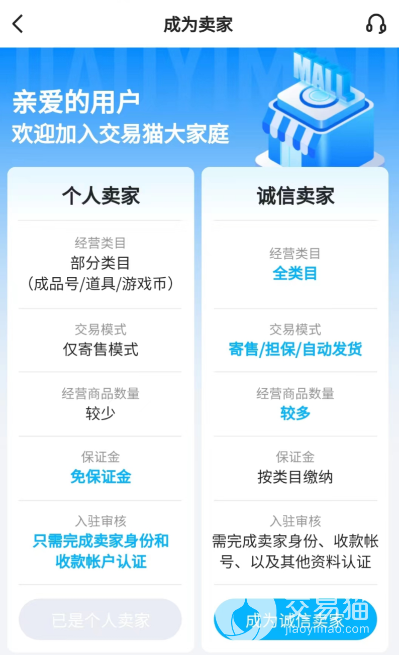 交易貓有著自己嚴格且安全性能很高地流程操作,但其實你想要在這里注冊成為某個身份很簡單,就比如平臺會根據(jù)你想出售賬號的類目、數(shù)量來分為個人和誠信兩種類型的商家,對于想出售某一個賬號的一般玩家而言成為個人商家即可,要是后續(xù)有意繼續(xù)出售各種資源號或是其他類目賬號的話,也能再補充資料成為誠信商家,不管你想注冊成為任意一種商家,都是憑借簡單的身份信息認證就能完成,且每種商家的優(yōu)勢所在也均有展示。