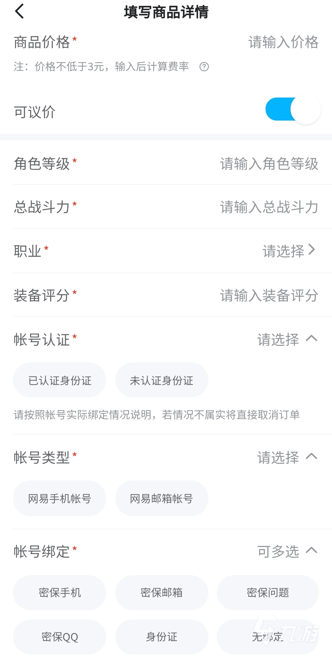 商品發(fā)布也很簡(jiǎn)單,很多賣家可能苦惱該如何描述,像是倩女幽魂這款游戲,填寫(xiě)內(nèi)容有角色等級(jí)、總戰(zhàn)斗力、職業(yè)、裝備評(píng)分以及一些基礎(chǔ)信息。最終這些信息都會(huì)呈現(xiàn)在商品詳情頁(yè)中,便于買家更快速、全面的了解你的賬號(hào)情況,而且平臺(tái)這一貼心行為,也省去了賣家的不少麻煩。