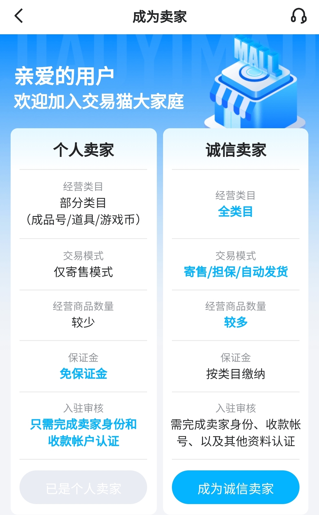 下載、注冊(cè)這些常規(guī)步驟相信大家都清楚,只需完成賣家身份和收款賬戶認(rèn)證就能成為個(gè)人賣家了。除了個(gè)人賣家,還有一類是誠(chéng)信賣家,經(jīng)營(yíng)類目、交易模式、經(jīng)營(yíng)商品數(shù)量會(huì)更多,當(dāng)然需要進(jìn)行的認(rèn)證項(xiàng)目也更多一些。不過(guò)各位作為玩家出售賬號(hào),成為個(gè)人賣家就足夠啦!