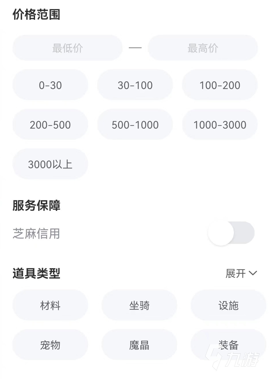 在專區(qū)中大家可以看到有非常豐富的出售,選擇有成品號,禮包,道具,游戲幣,初始號等一系列內(nèi)容。最關(guān)鍵的除了成品號之外還有道具,這是非常重要的一項功能,可以自己選擇需要的類型,包括材料,坐騎,裝備,寵物等,各種種類一應俱全,提高了出售的渠道。