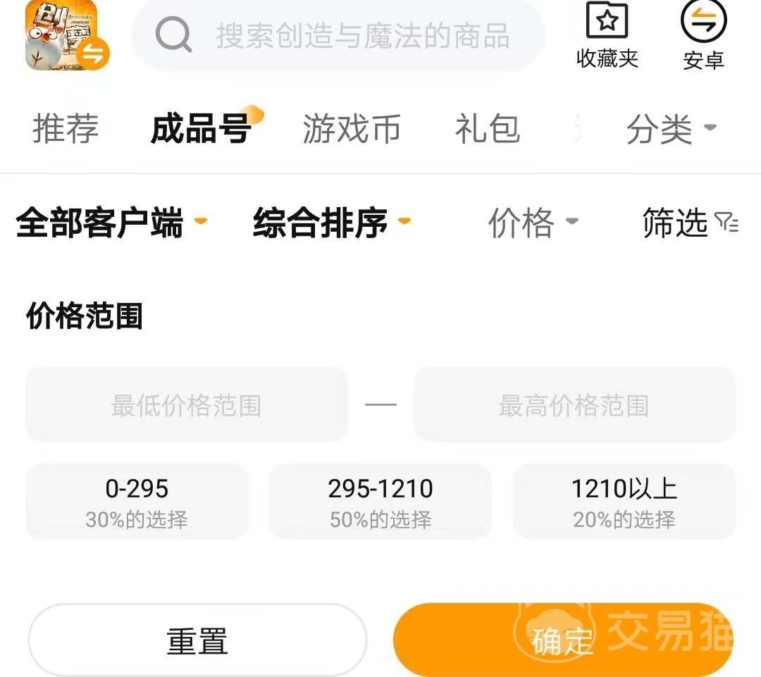 現(xiàn)在閑置的游戲賬號也能進(jìn)行交易了,在游戲賬號交易平臺的選擇上也有很多,同樣的價(jià)格也很合理。在交易貓上這款游戲的價(jià)格在300-1200之間的賬號最多同樣關(guān)注的玩家也最多,玩家在對自己賬號估值時(shí)可以參考這個(gè)價(jià)格區(qū)間,至于具體的定價(jià)就看玩家賬號內(nèi)其他道具資源的情況了。