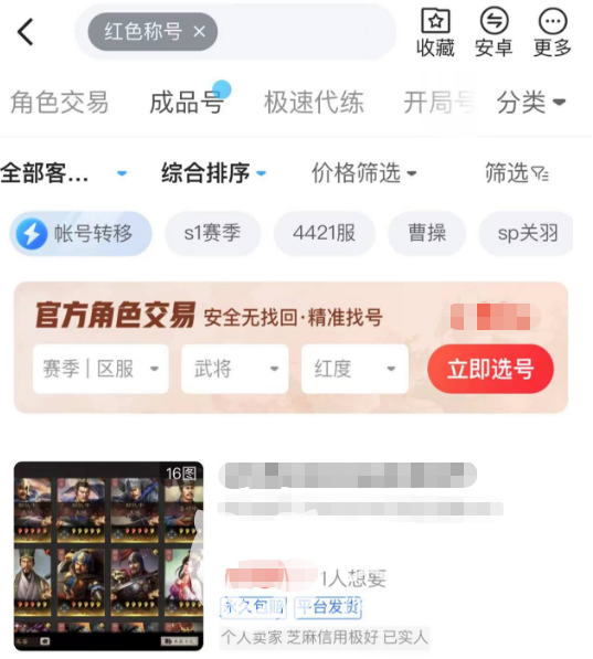 平臺里面是有專門為三國志戰(zhàn)略版搭建專區(qū)的,里面匯聚的賬號種類也是很多,像紅色稱號這種的,大家直接去搜索就能夠看到,并且價格上也是很具備吸引力,此外在交易的時候,小伙伴們也能發(fā)現(xiàn)商品的各個信息展示是比較齊全的,包括所持有的保障等,大家都是能夠在里面見到,如此一來交易的時候自然也就更加的放心了。