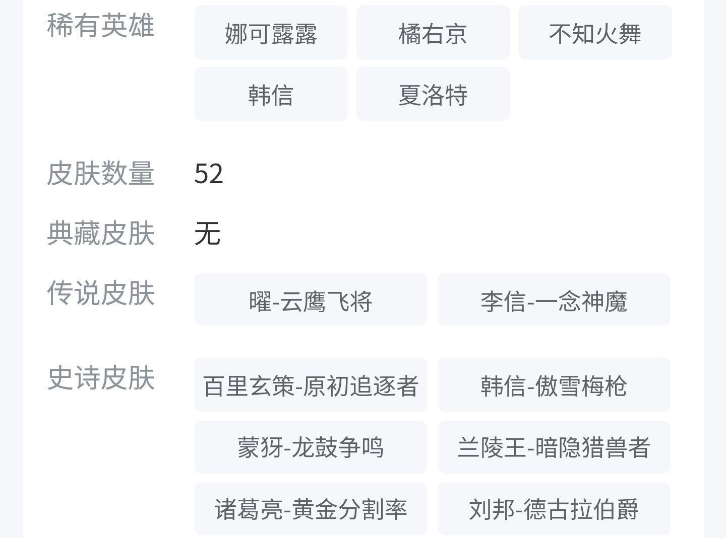 像王者的成品號最具價值的其實就是皮膚的多少,貴族等級什么的并不重要,而是直接引導賣家填寫自己賬號內(nèi)有沒有白虎志、裴擒虎的李小龍皮膚、關羽的寒冰皮膚等等,這些已經(jīng)不在商城內(nèi)售賣,而且確定很難返廠的皮膚會給整個賬號價值帶來巨大的提升,買家要對比而且重點看的就是這些,根據(jù)最上方將近20個可以上傳的截圖以及下面的描述就可以大概了解該賬號的信息了。