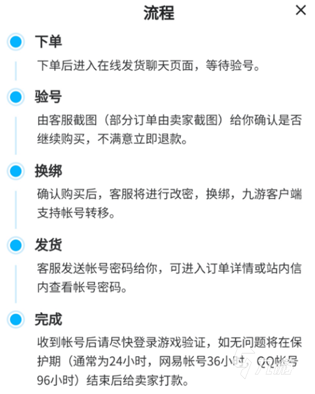 交易貓內的買號流程,都是會有專屬客服為大家服務的,不用太過擔心,游戲賬號的換綁和改密,購買賬號的售后,都由平臺完成,這樣可以最大的避免了賬號在交易過程中產生問題。