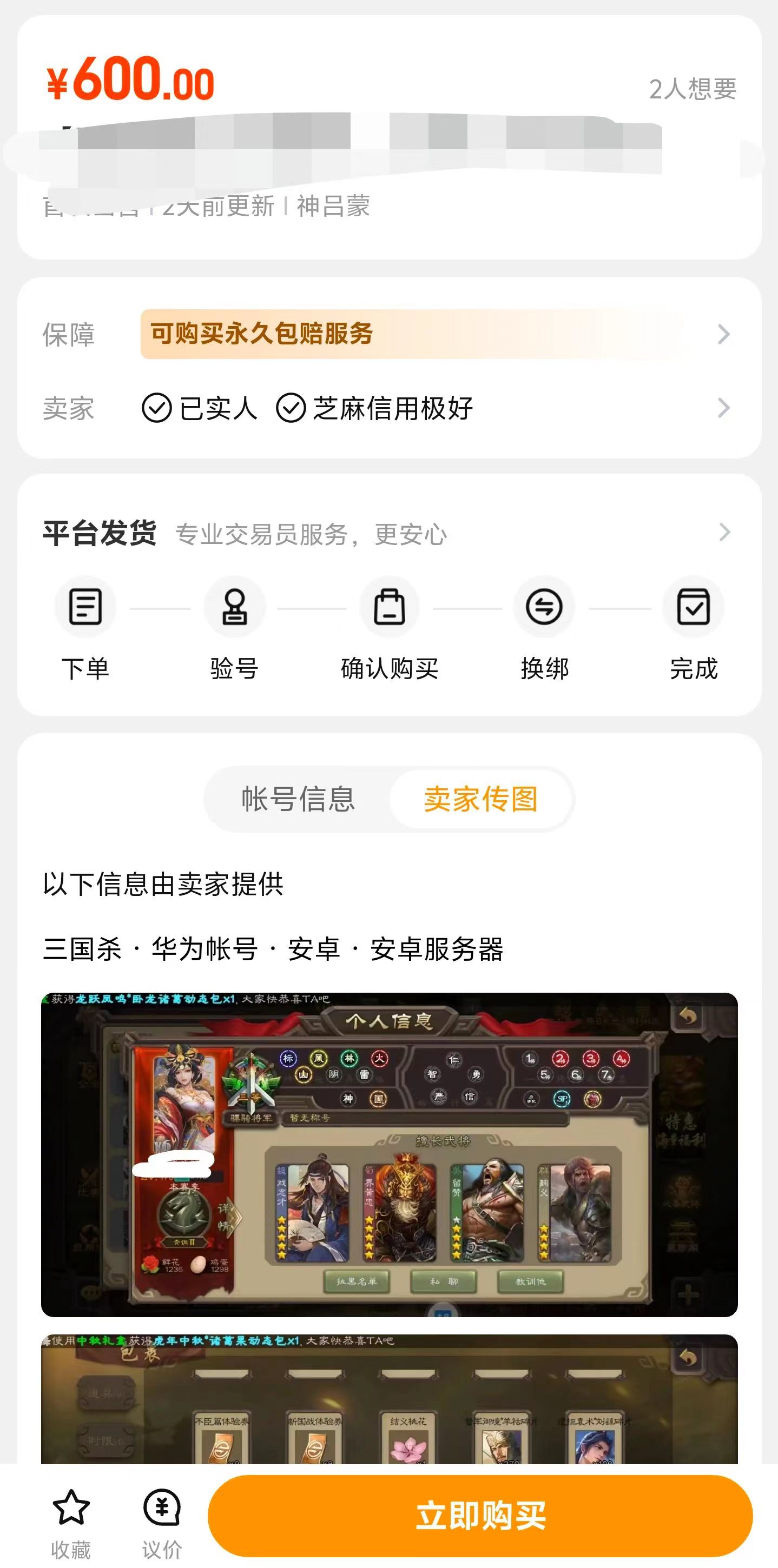 小編截取了一部分的三國(guó)殺游戲賬號(hào)的價(jià)格,這些游戲賬號(hào)賣家都簡(jiǎn)述了這個(gè)賬號(hào)所擁有的道具、武將、等級(jí),我們可以根據(jù)這些賣家所出售的賬號(hào)來(lái)估計(jì)一下我們自己的三國(guó)殺賬號(hào)價(jià)值多少,由于在交易貓交易三國(guó)殺賬號(hào)的賣家十分豐富,這樣我們就可以更加細(xì)致的了解自己的賬號(hào)價(jià)值。